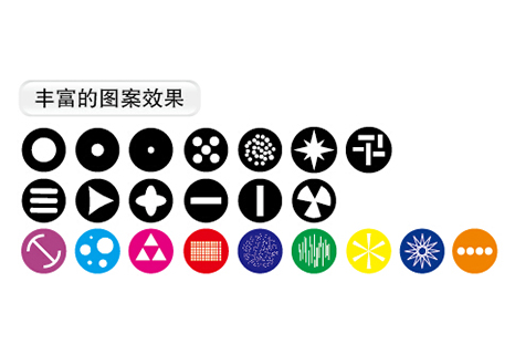 1個(gè)旋轉(zhuǎn)圖案盤:9個(gè)自轉(zhuǎn)圖案+白光,具有變速抖動(dòng)效果、雙向變速流動(dòng)效果,自轉(zhuǎn)圖案片可換。圖案片外形直徑Ф15.9mm,圖案有效直徑Ф13mm