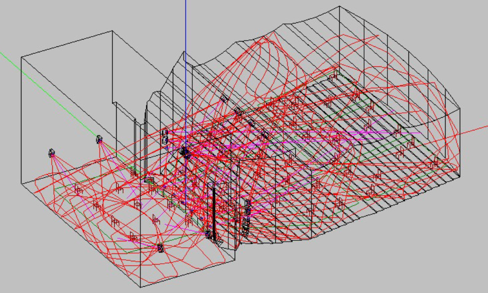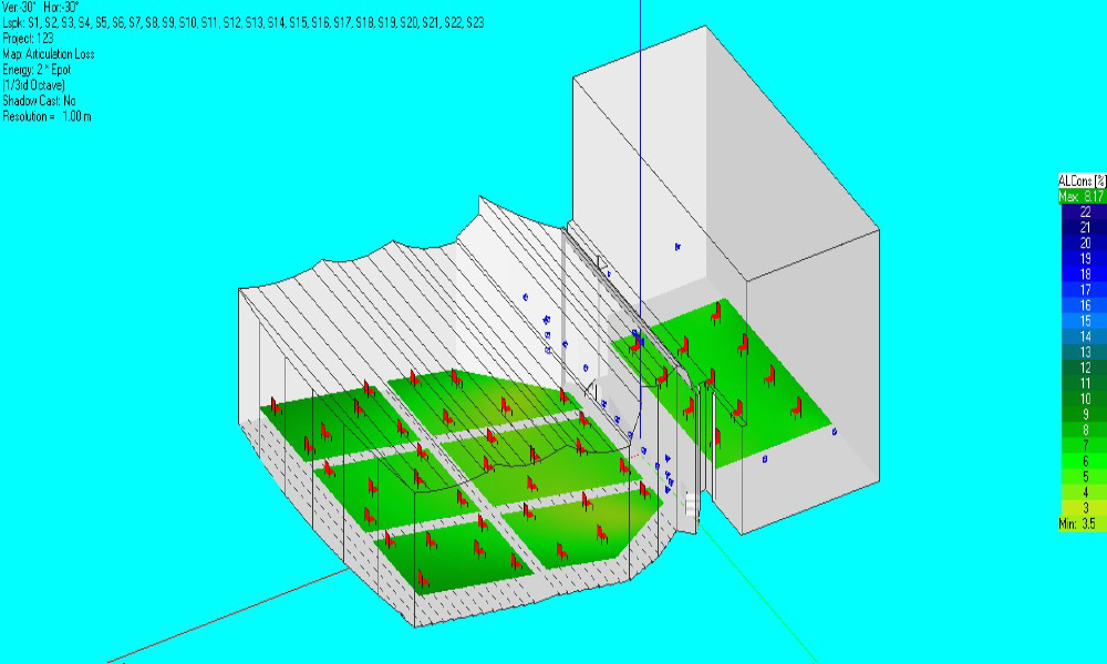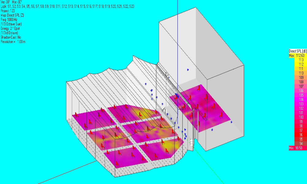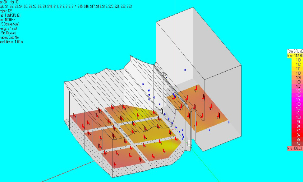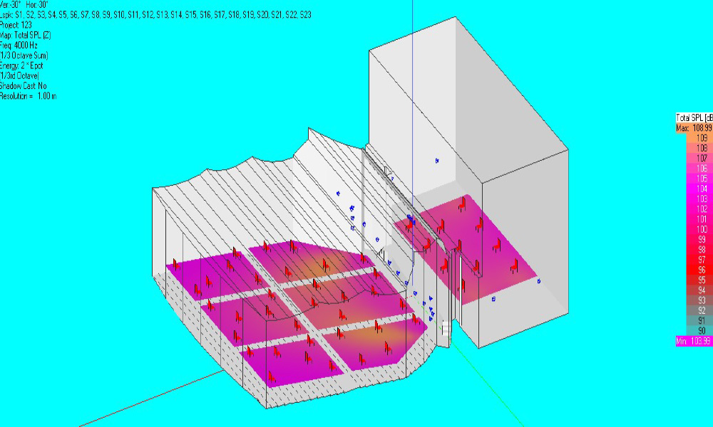本項目系統(tǒng)較多,為了能把這次的改造工作做到盡可能的,我們認真采集現(xiàn)場房間的數(shù)據(jù)后,利用EASE4.0軟件,對影劇院的聲場擴聲進行計算機模擬輔助設計,通過音箱選型后,影劇院 的模擬設計各項指標都達到了國家相關標準《GB50371-2006》劇場類一級標準。